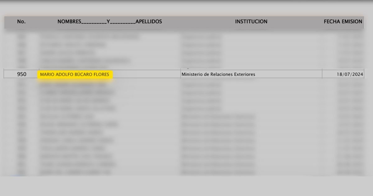 En la casilla 950 se consigna el nombre de Mario Adolfo Búcaro Flores, identificado como integrante del equipo de la Cancillería. Su pasaporte diplomático fue emitido el 19 de julio de 2024 y actualmente figura como vigente en se documento oficial.