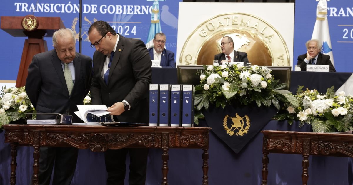 A la izquierda aparecen Carlos Ramiro Martínez y Mario Búcaro durante la transición de administración. Al fondo están Bernardo Arévalo y Alejandro Giammattei. (Fotografía: Gobierno de Guatemala)