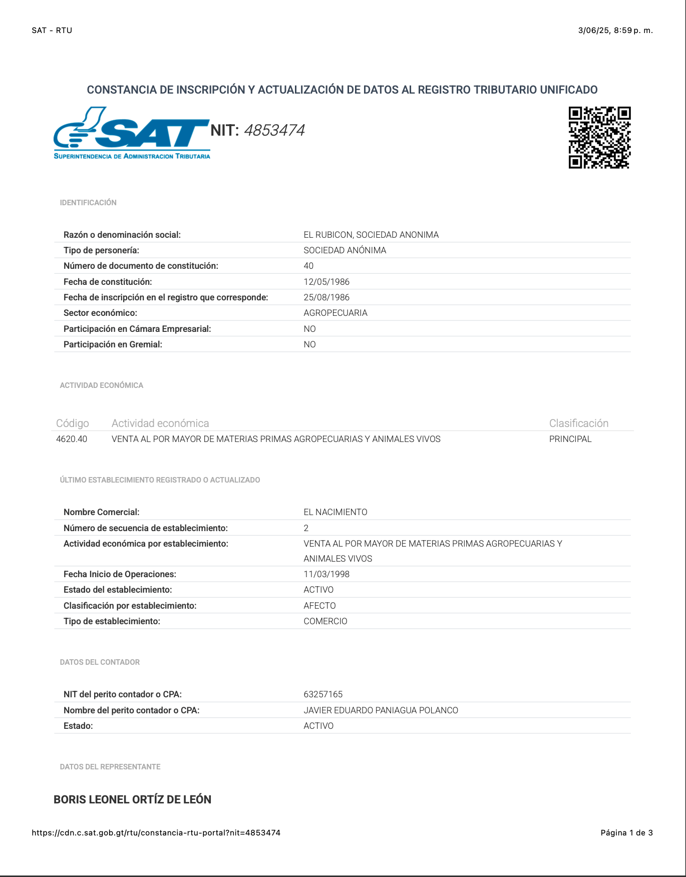 En los registros de la Superintendencia de Administración Tributaria (SAT), Javier Eduardo Paniagua Polanco aparece como el contador de la sociedad El Rubicón, propietaria de la finca El Nacimiento ubicada en las faldas del volcán de Agua en el municipio de Santa María de Jesús en el departamento de Sacatepéquez.