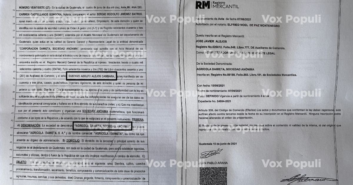 La notaria que la constituyó Agrícola Damieta es Ana del Carmen Castellanos Góngora, quien ha creado otras empresas para Gustavo Alejos como: Inmobiliaria Damieta y Corporación Damieta. También hay otra empresa llamada Agroindustria Damieta que fue registrada por el notario Juan Luis Rodríguez González.