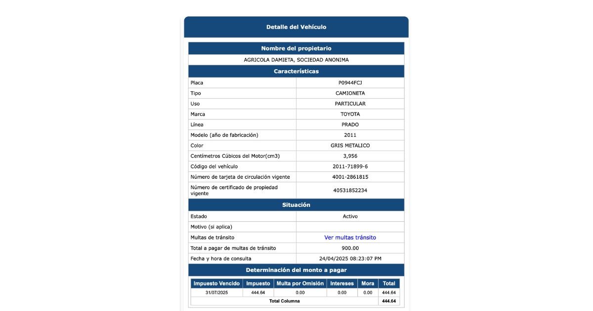 Desde que empezó a usar la Toyota Prado, el carro acumula nueve multas de tránsito. Todas son en la misma dirección: Boulevard Los Próceres y 18 calle de la zona 10 capitalina, dirección cercana a su residencia.