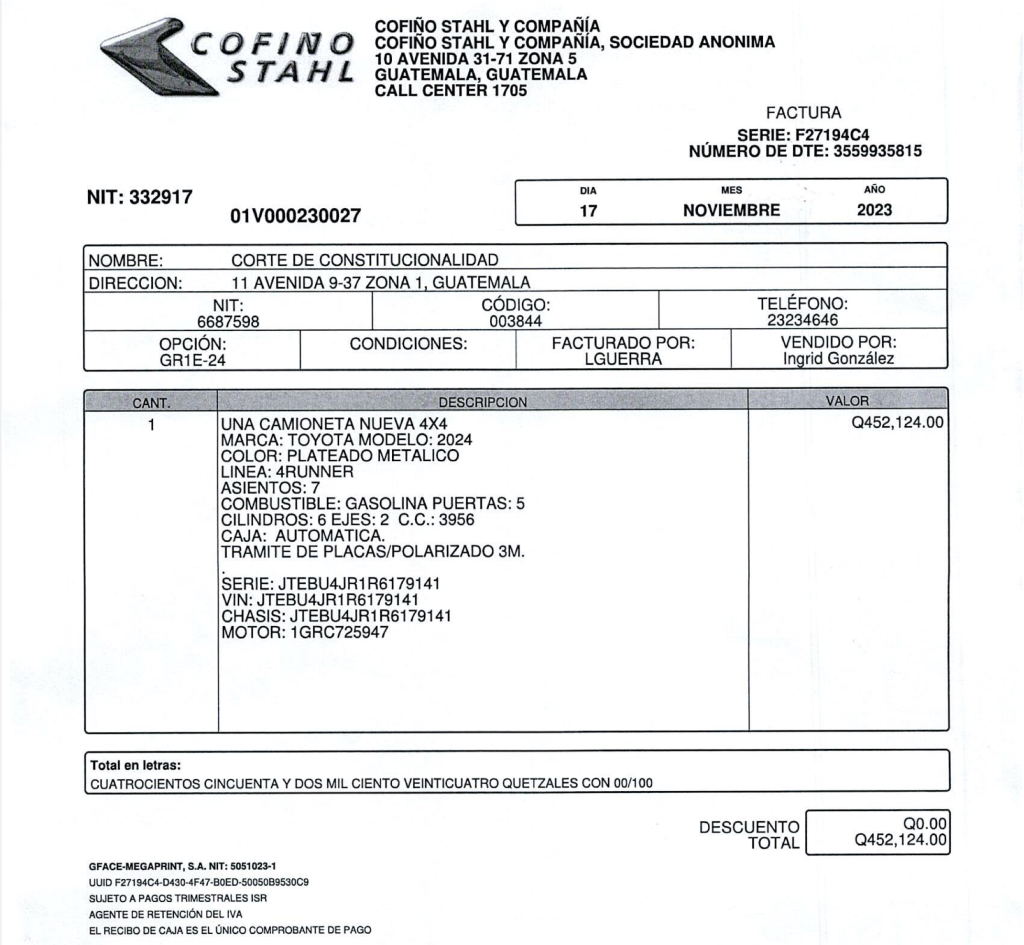 Los magistrados titulares de la CC decidieron renovar la flotilla de vehículos que tienen asignados. De esa cuenta, en noviembre pasado pagaron Q2.2 millones a Cofiño Stahl, S.A. por cinco camionetas Toyota 4Runner modelo 2024.