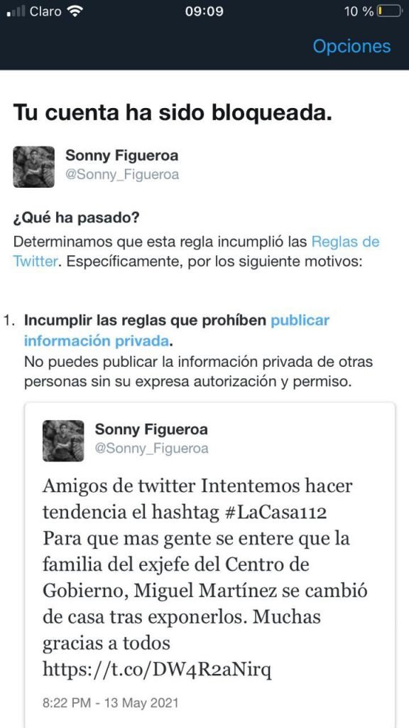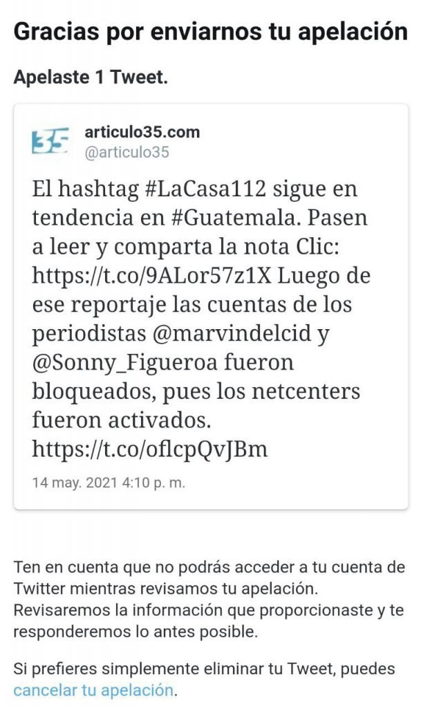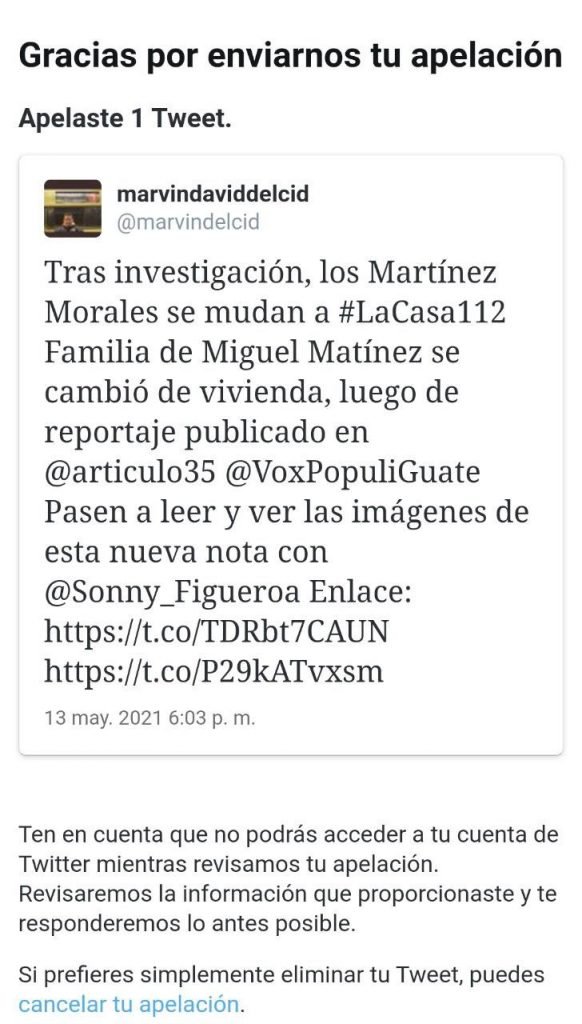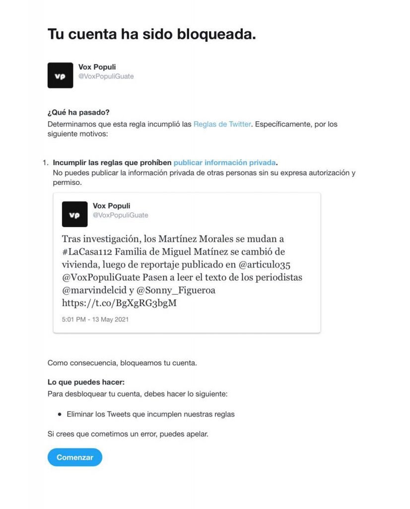 En mayo de 2021 las cuentas de Artículo 35, Vox Populi, Marvin Del Cid y Sonny Figueroa fueron bloqueadas tras una serie de denuncias recibidas por parte del netcenter del Gobierno. Ese día se publicó una investigación sobre el exdirector del Centro de Gobierno, Miguel Martínez. (Imágenes: Artículo 35 / Vox Populi)