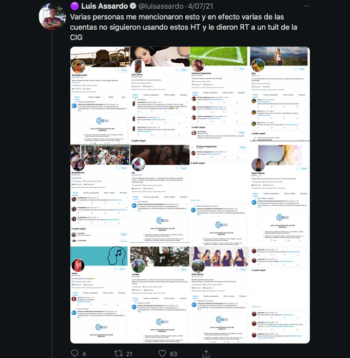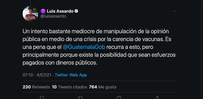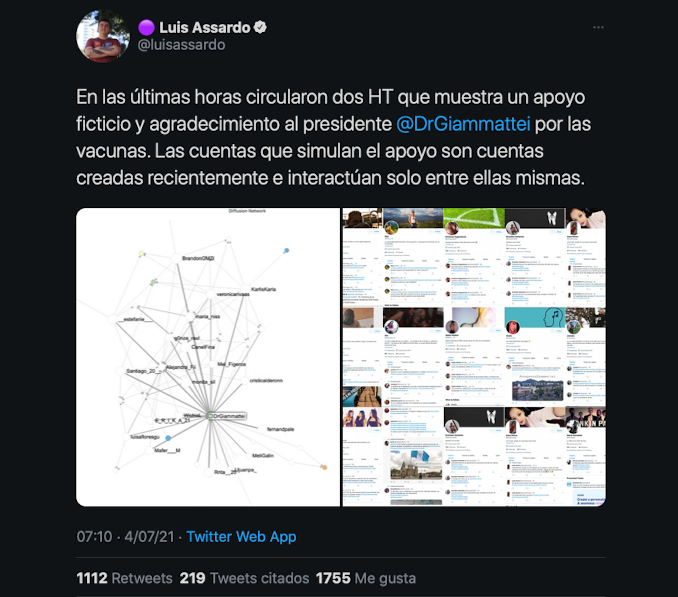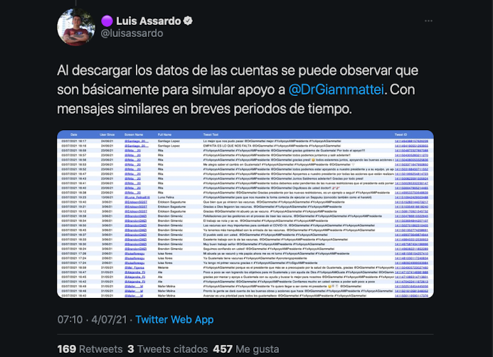 El periodista Luis Assardo quien realiza investigaciones sobre ese tema dio a conocer cómo hace algunos días varias cuentas en Twitter creadas recientemente apoyar al presidente Alejandro Giammattei con el tema de las vacunas.