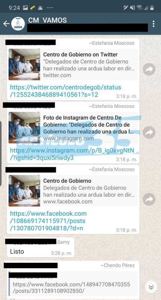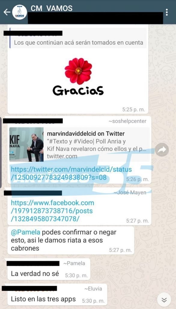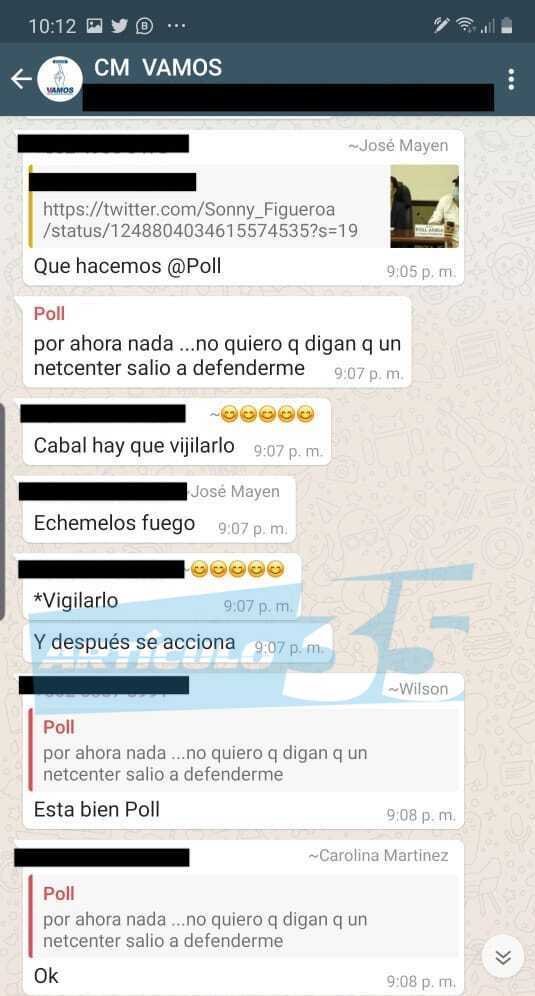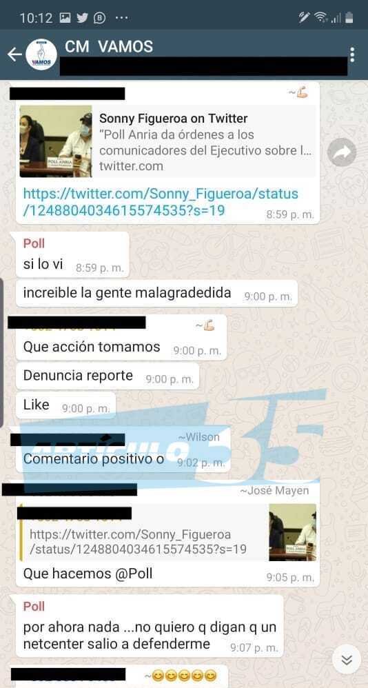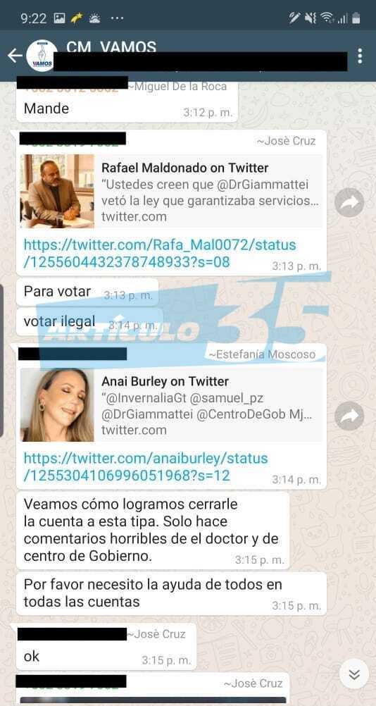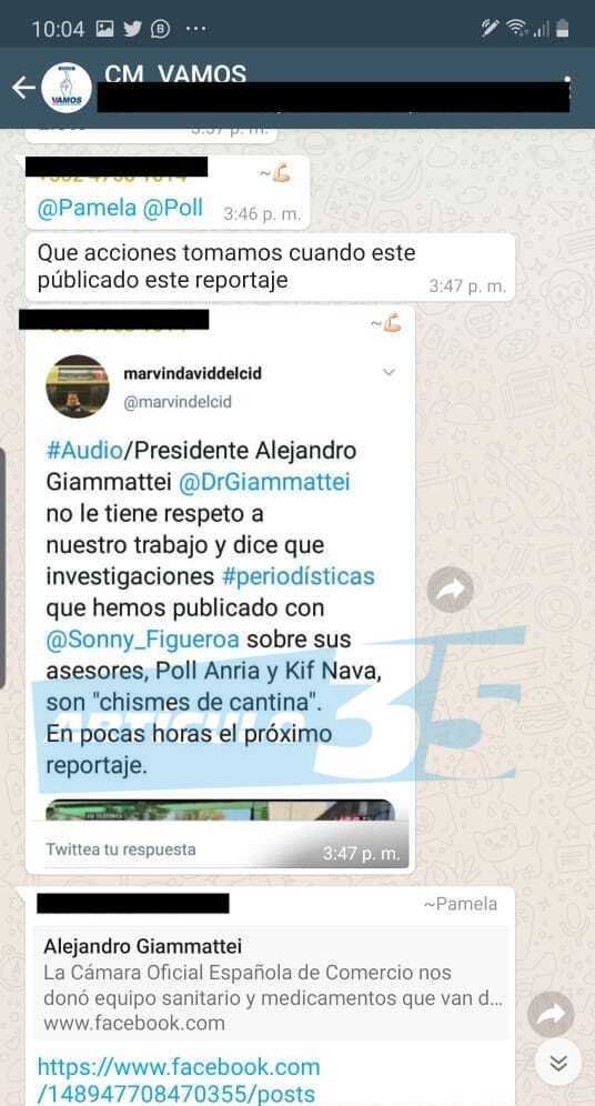 En el grupo “Vamos CM” los integrantes pedían ordenes de Anria para responder a las publicaciones de redes sociales de los autores de las investigaciones: Marvin Del Cid y Sonny Figueroa.