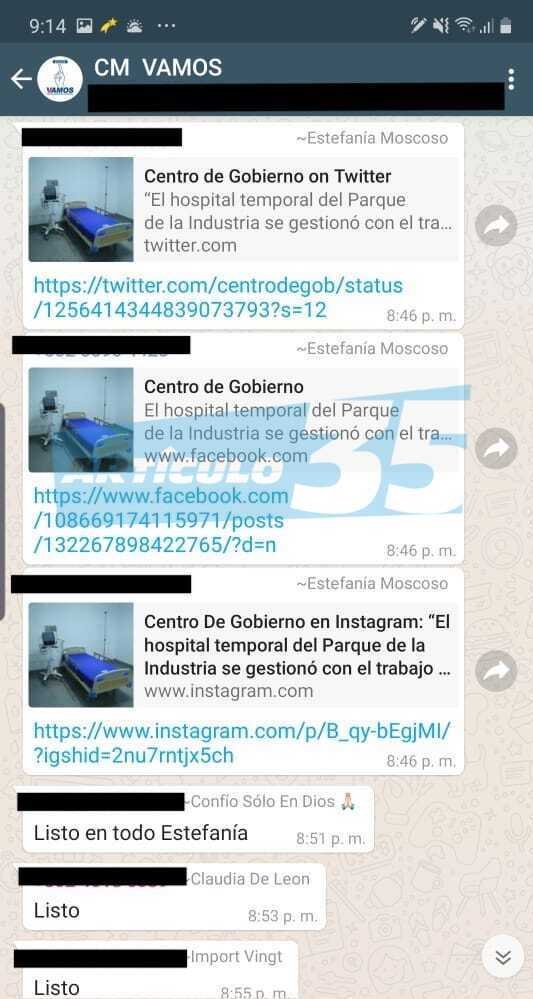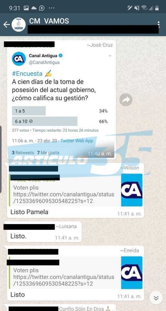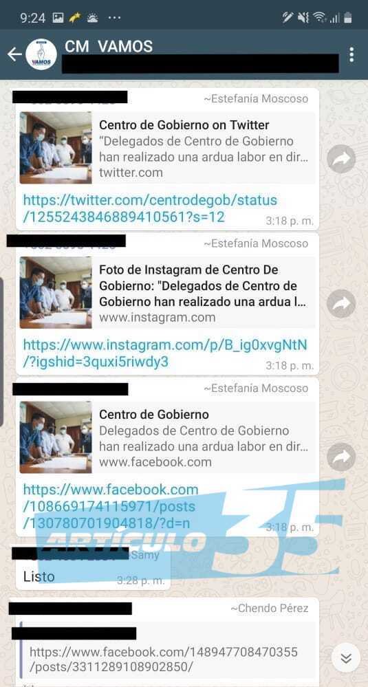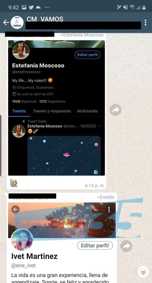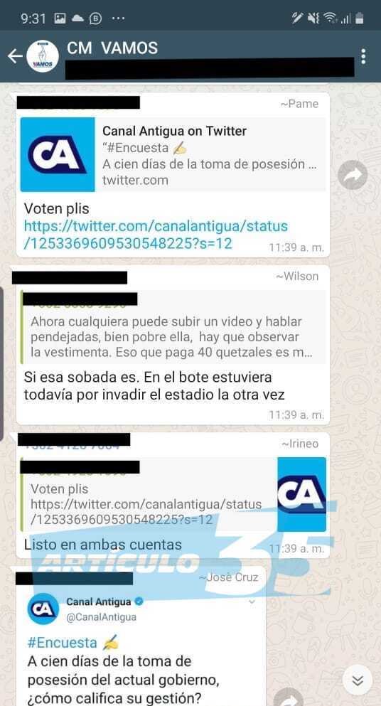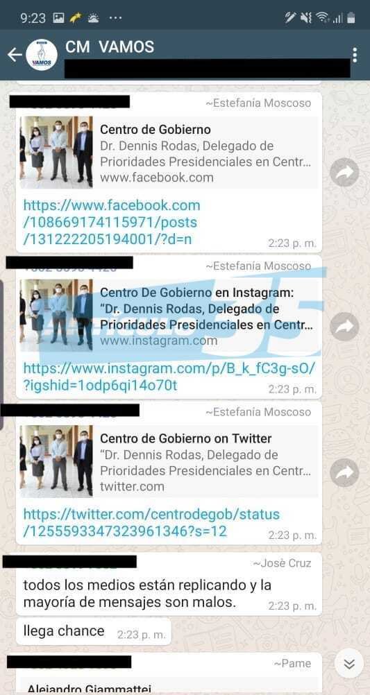 En el grupo “Vamos CM” los integrantes pedían ordenes de Anria para responder a las publicaciones de redes sociales de los autores de las investigaciones: Marvin Del Cid y Sonny Figueroa.