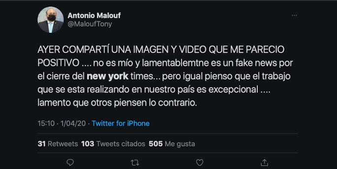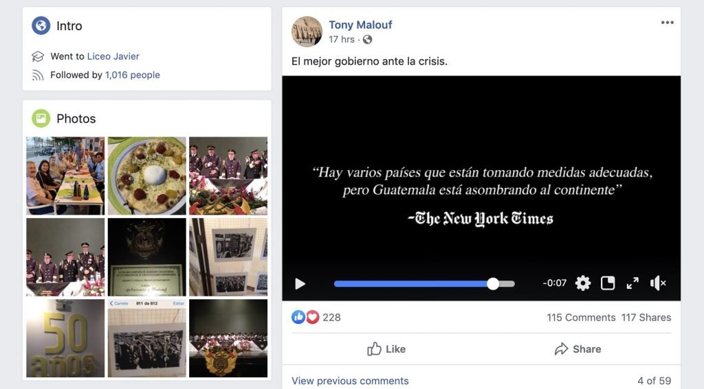 El 31 de marzo de 2020 el ministro de Economía, Antonio Malouf, publicó en su perfil de Facebook un supuesto video elaborado por el medio estadounidense New York Times en el que se alaba la gestión de Giammattei ante la pandemia del COVID-19. El video resultó ser falso y el funcionario tuvo que eliminarlo de su red social.