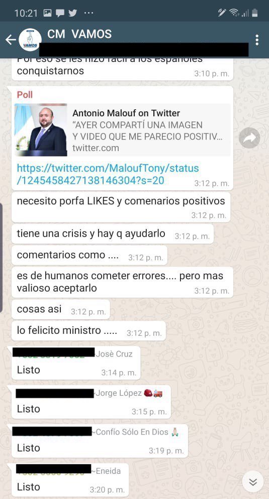 El grupo de WhatsApp “Vamos CM” inicialmente tenía como propósito compartir información del entonces candidato Alejandro Giammattei, pero en ese chat también se coordinaban ataques en contra de otros candidatos a la presidencia.