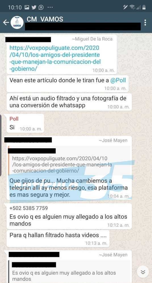 En el grupo de WhatsApp llamado «Vamos CM» se coordinan ataques contra ciudadanos y periodistas críticos a la administración del presidente Alejandro Giammattei. También se planifica estrategias para apoyar a funcionarios del Ejecutivo. (Imágenes: Artículo 35 / Vox Populi)