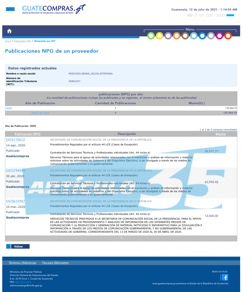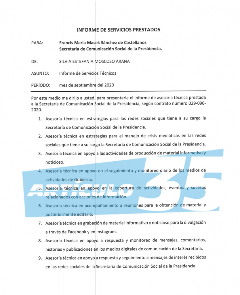 Silvia Estefanía Moscoso Arana trabajó en 2020 en la Secretaría de Comunicación Social de la Presidencia y fue contratada por el entonces secretario, Carlos Sandoval y durante 2020 bajo el renglón 029 recibió Q135 mil.