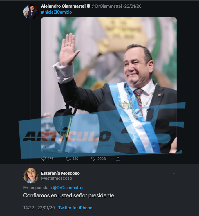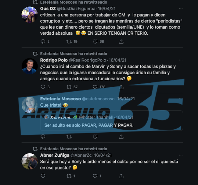 El 15 de abril del presente año, Artículo 35 y Vox Populi publicaron el reportaje La tuitera de Giammattei que explicaba las funciones de Pamela Morán Peña dentro de la presidencia. Tras esa publicación, Moscoso Arana dio retuit a los comentarios que atacaban las publicación al igual que su pareja sentimental Abner Zuñiga que tiene la cuenta en Twitter, @abnerzc.