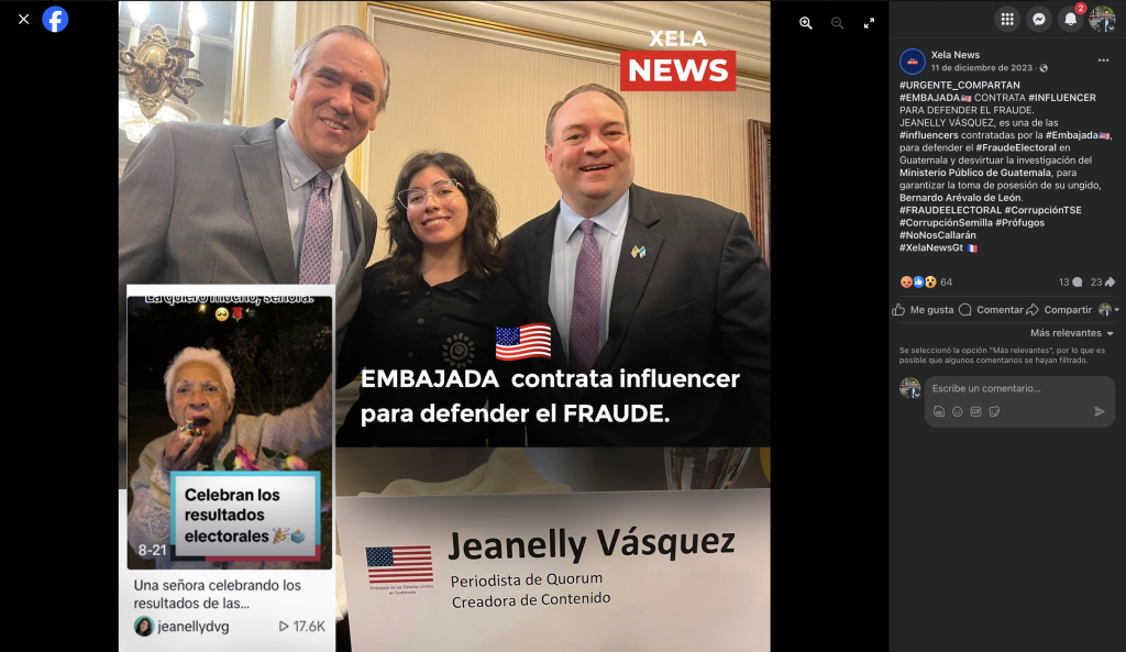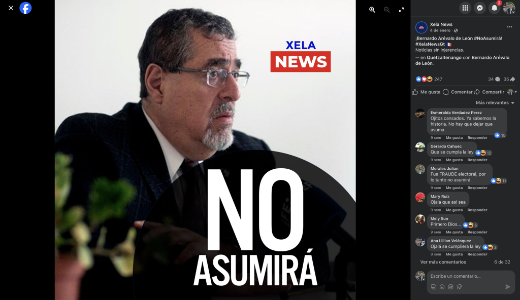 Xela News, al igual que otras fanpage que operan desde el anonimato, promueve el discurso de que en las elecciones de 2023 hubo fraude y durante la época de transición apoyaban junto a su fundador Gustavo Cardenas que Bernardo Arévalo no tomara posesión el 14 de enero de 2024.