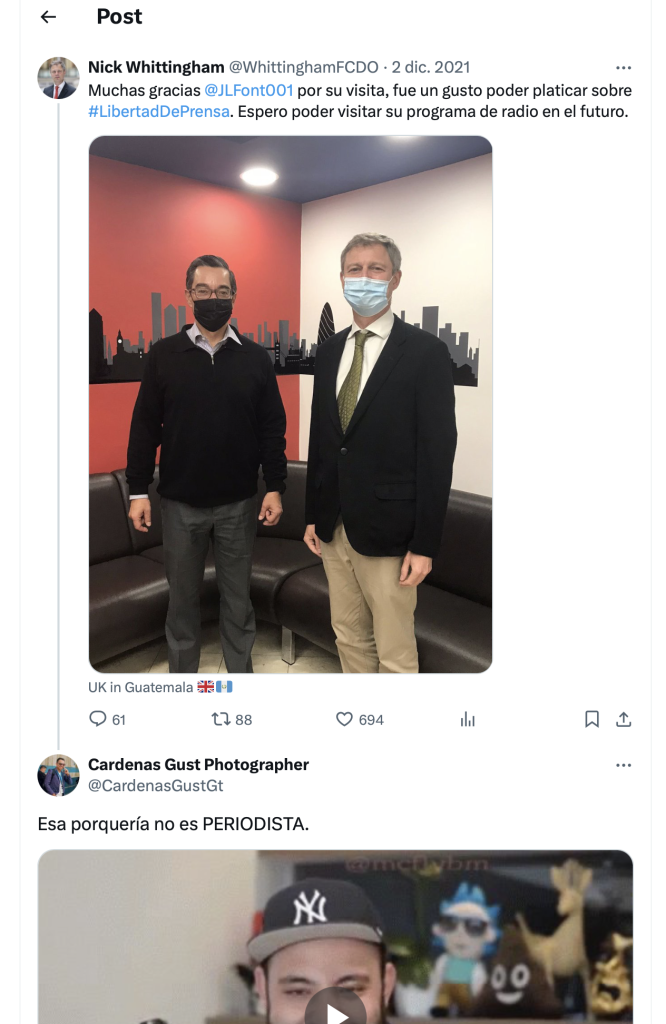 Gustavo Cardenas usa Xela News para atacar a periodistas y también lo hace a título personal. Integrantes de Vox Populi han sido parte de las personas a quienes se ha dedicado a difamar en redes sociales, ataques que empezaron durante el gobierno de Giammattei.