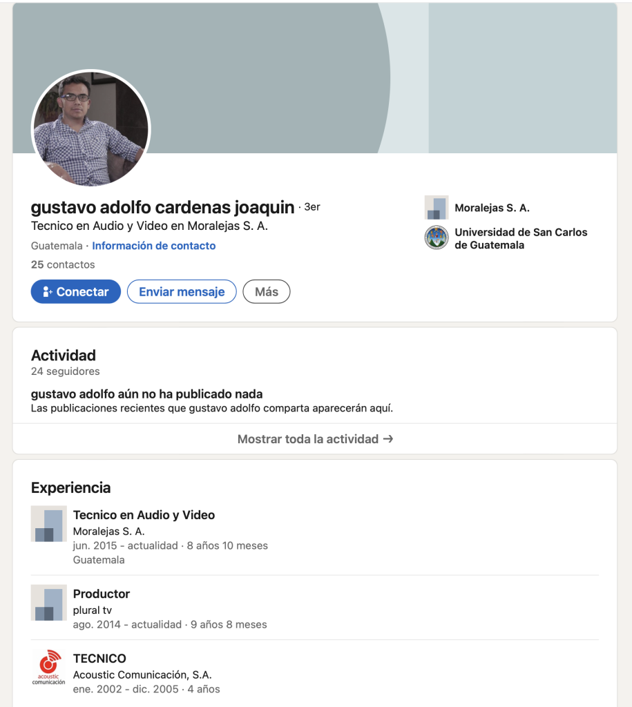 En su perfil de LinkedIn asegura que trabaja actualmente en el programa Moralejas (que pertenece a los hermanos Jimmy Morales y Sammy Morales). Desde 2015 labora en ese lugar como técnico en audio y video.