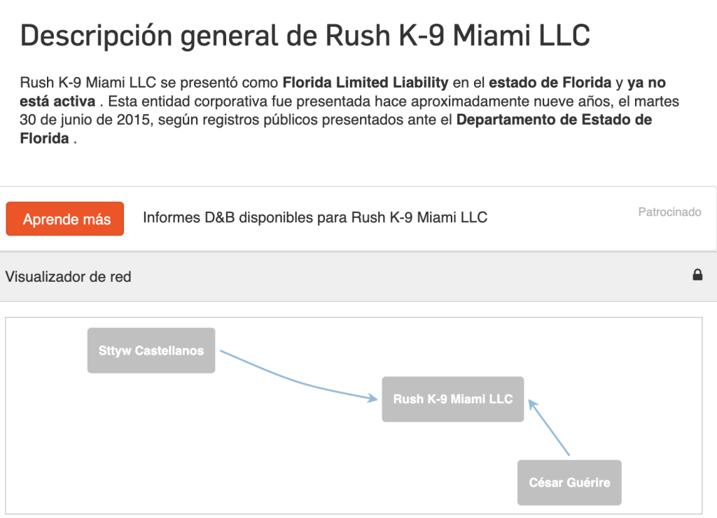 Esa dirección la ha utilizado la compañía Rush K-9 Miami LLC en la cual figuraba Alejandro Castellanos como gerente junto a César Augusto Guerire.