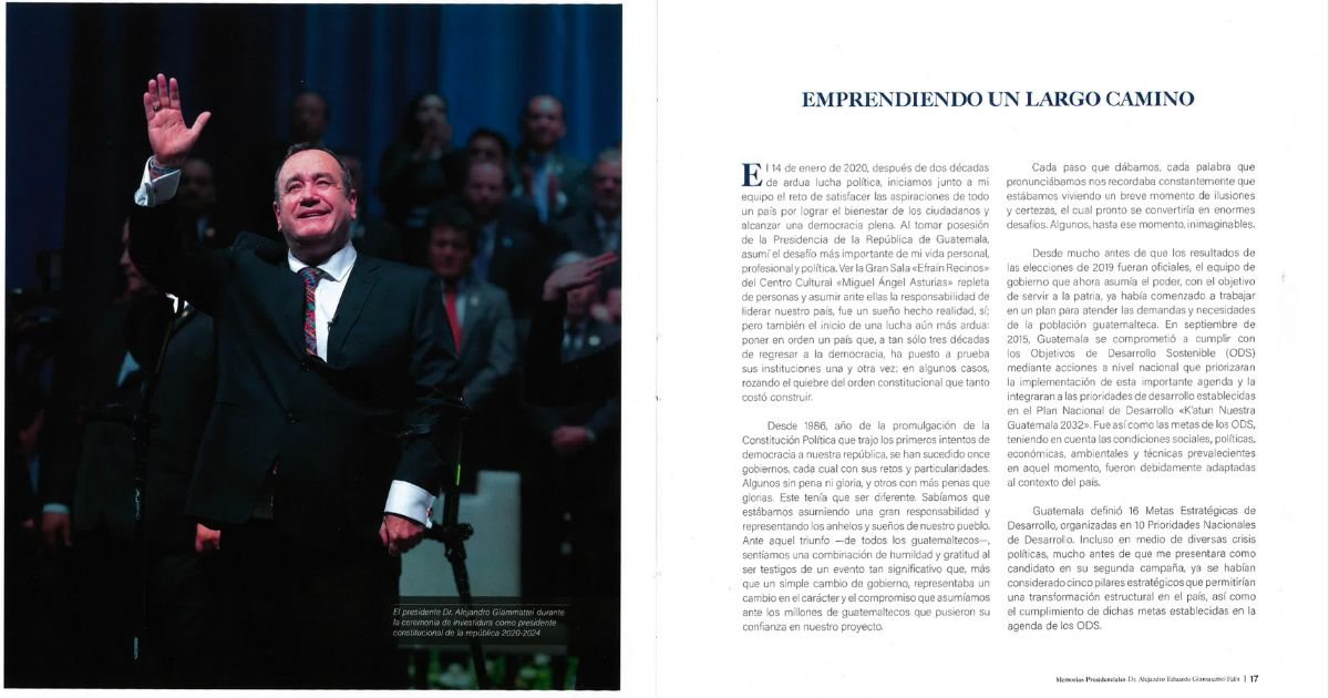 Giammattei abre el libro diciendo que ser presidente de Guatemala fue el desafío más importante en lo personal, profesional y político, recordando aquel 14 de enero de 2020 en que fue juramentado.