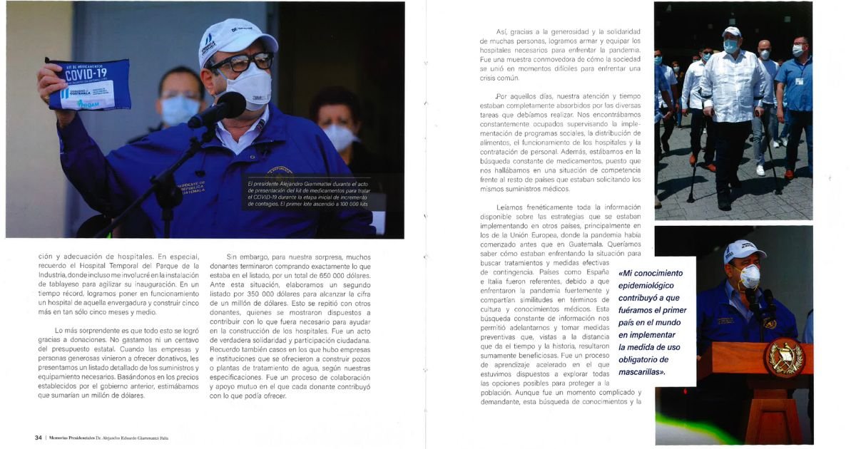 En el libro, Giammattei se jacta de que, gracias a él, Guatemala fue el primer país en hacer obligatorio el uso de las mascarillas cuando se esparcía la pandemia por COVID-19, lo que impidió que hubiera tantos enfermos y fallecidos. Incluso, asegura que fue criticado por organismos internacionales, pero sostuvo la medida.