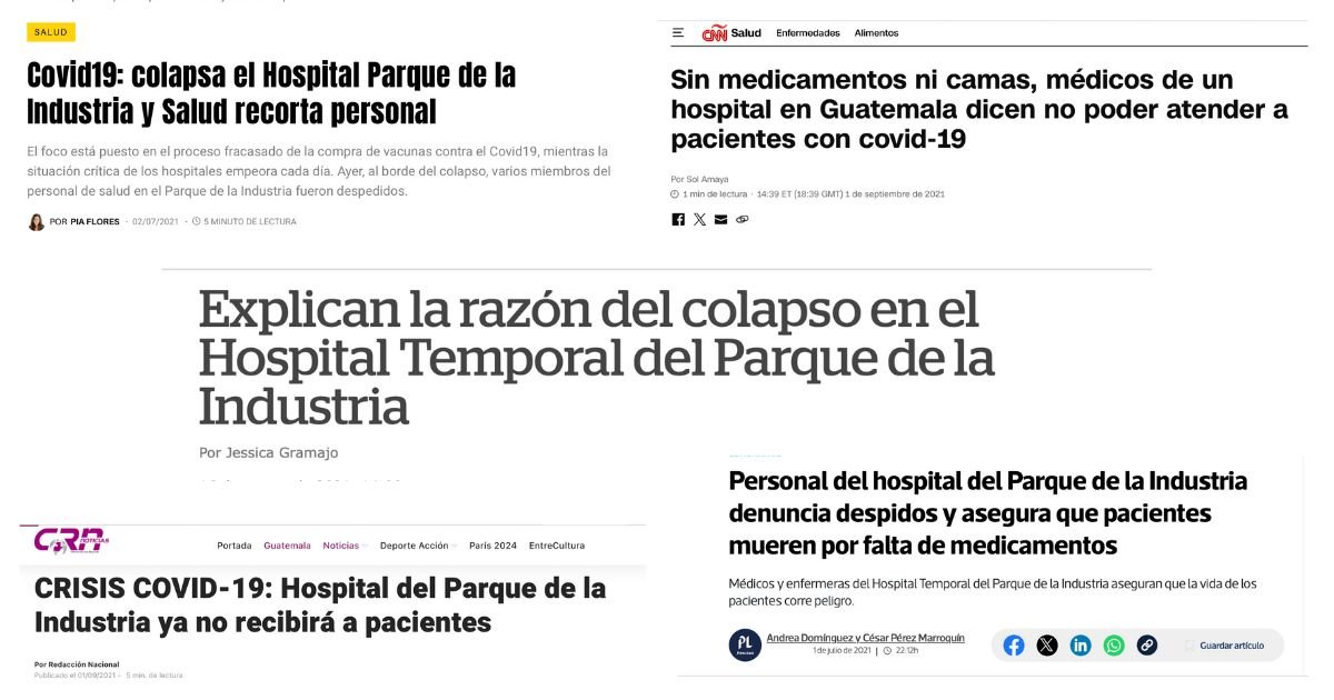 Durante la etapa de pandemia, el gobierno de Giammattei anunció la construcción de un hospital en el Parque de la Industria. En el texto asegura que fue el “hospital y centro de cuidado intensivo más grande de Centroamérica”, aun cuando colapsó en varias ocasiones por la falta de insumos, medicamentos y personal.