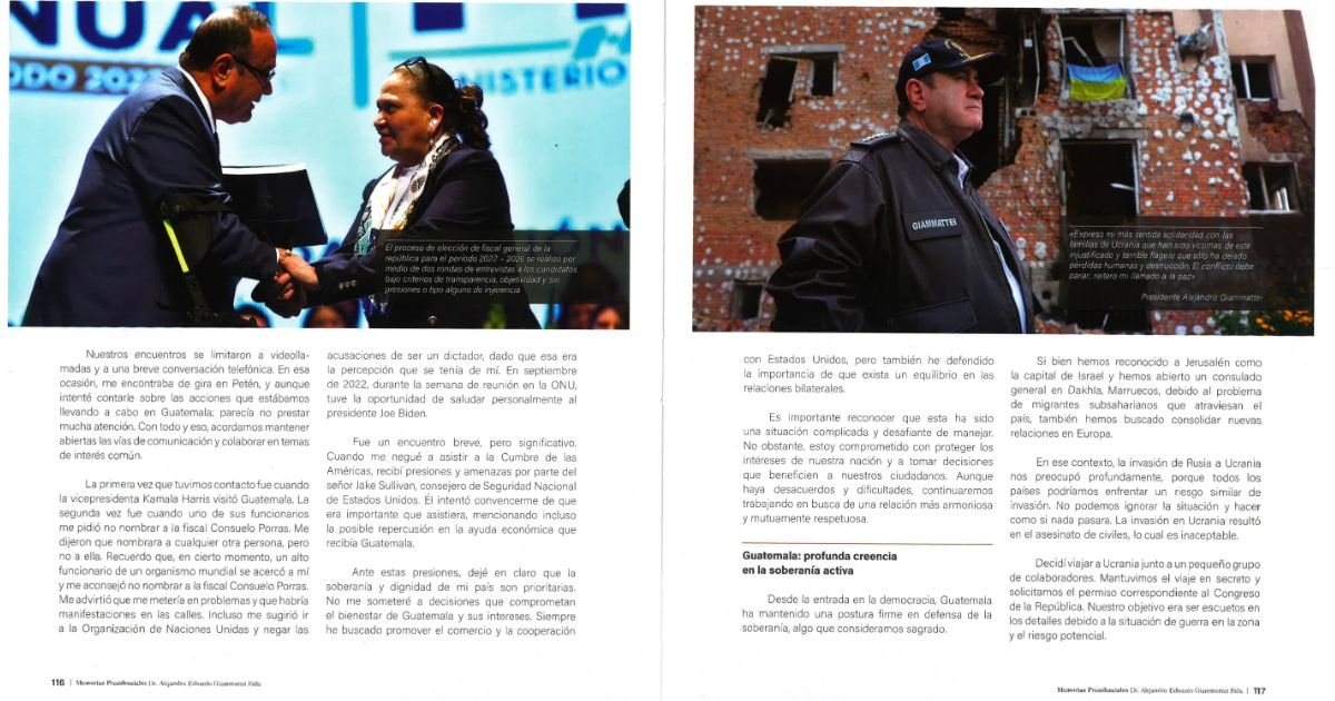 En el libro hay varias fotografías de Consuelo Porras. Una de estas cuando se dan la mano con Giammattei tras su reelección y otra del año 2023 cuando rindió su informe anual de labores.