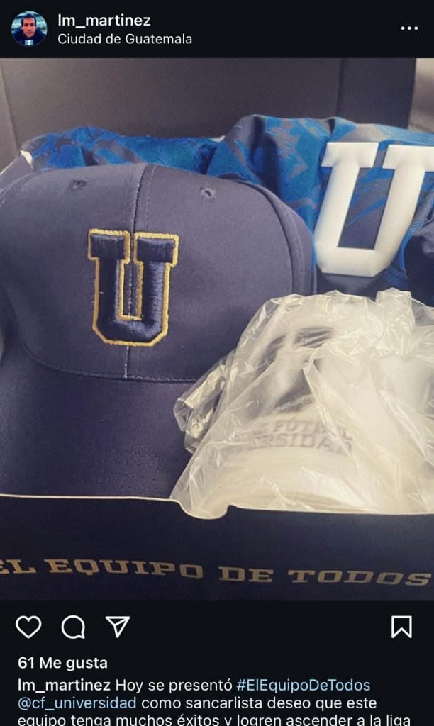 Martínez Morales, también tiene vínculos con el CF Universidad. De hecho, Vox Populi cuenta con fotografías que confirman que estuvo presente en la conferencia de prensa del 9 de noviembre de 2022 en la que el rector Walter Mazariegos recibió la ficha de la primera división que adquirió de parte del equipo Comunicaciones B, y en enero de 2023 ese equipo ya compartía residencia con Martínez.