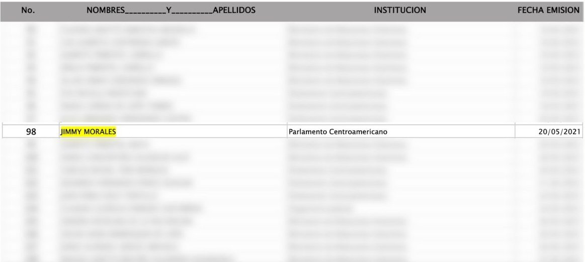 En ese listado, Jimmy Morales aparece en la casilla 98, identificado como integrante del Parlamento Centroamericano, cargo que ocupó de 2020 a 2024 tras dejar la Presidencia. Su pasaporte diplomático fue emitido el 20 de mayo de 2021 y continúa vigente.