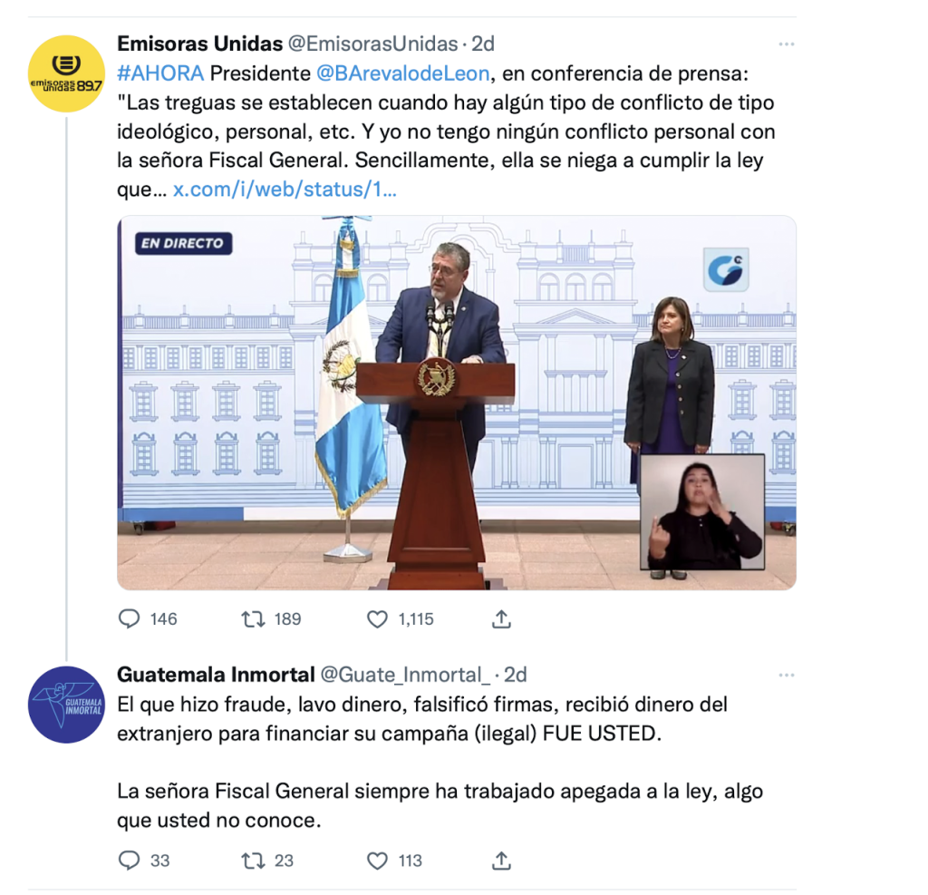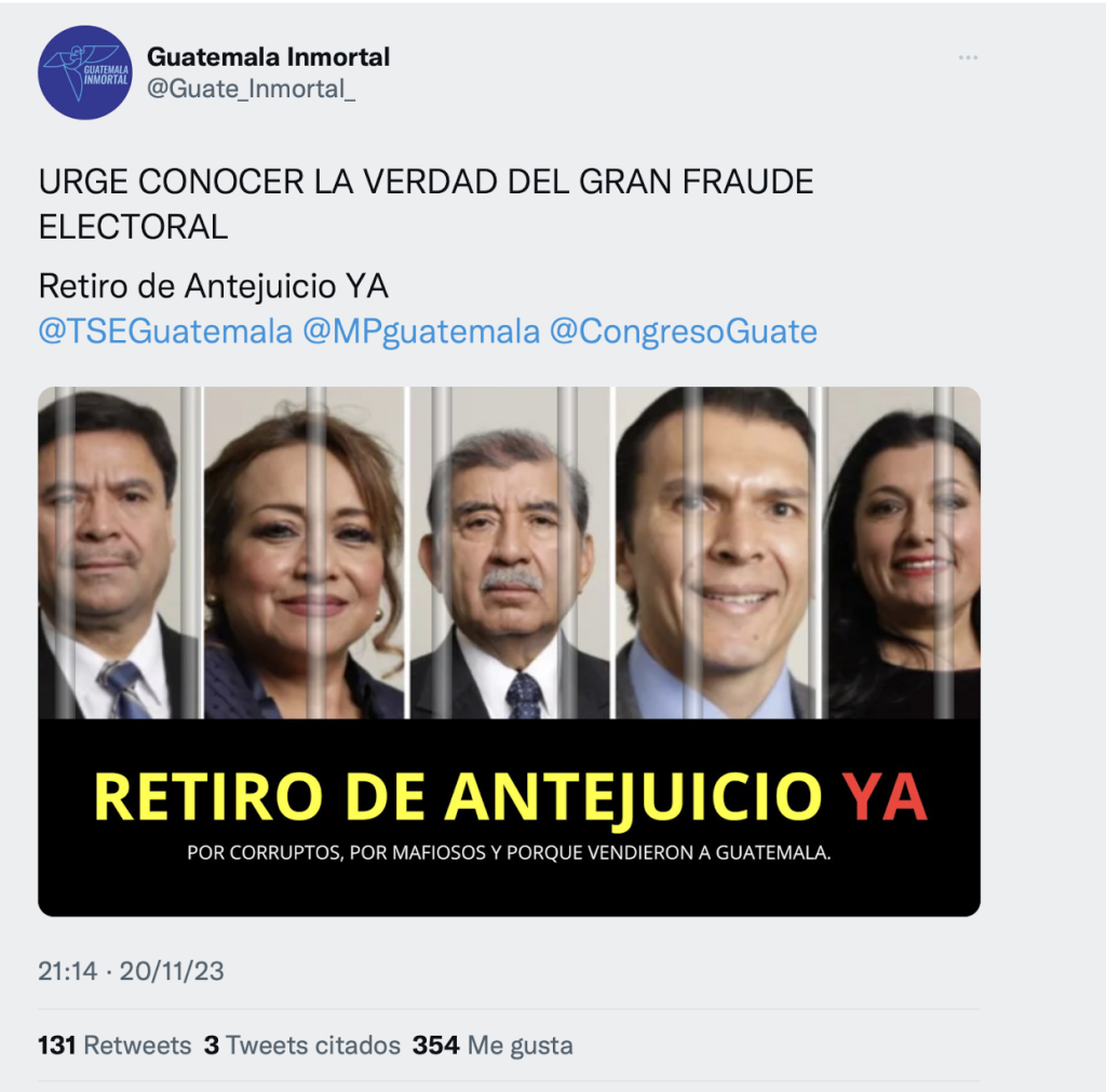 Miembros de Guatemala Inmortal han presentado denuncias en contra de Bernardo Arévalo y dispersan la narrativa en rede sociales de que hubo fraude en las elecciones en las que resultó ganador el binomio presidencial del partido Movimiento Semilla. Este discurso también es usado por las propietarias de Red América en sus redes sociales.