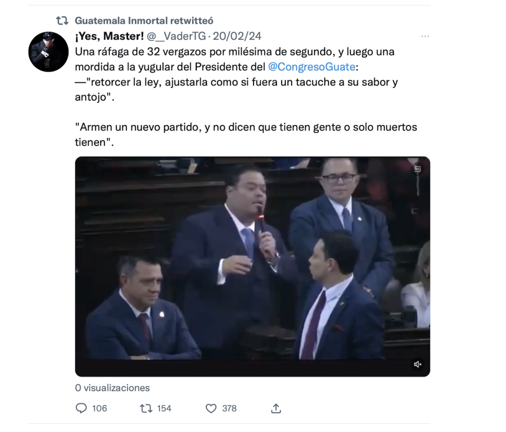 La cuenta de X de Guatemala inmortal es una de las cuentas que tiene más interacción con ¡Yes Máster!. En sus publicaciones que apoyan a la fiscal general, Consuelo Porras y al jefe de la FECI, Rafael Curruchiche.