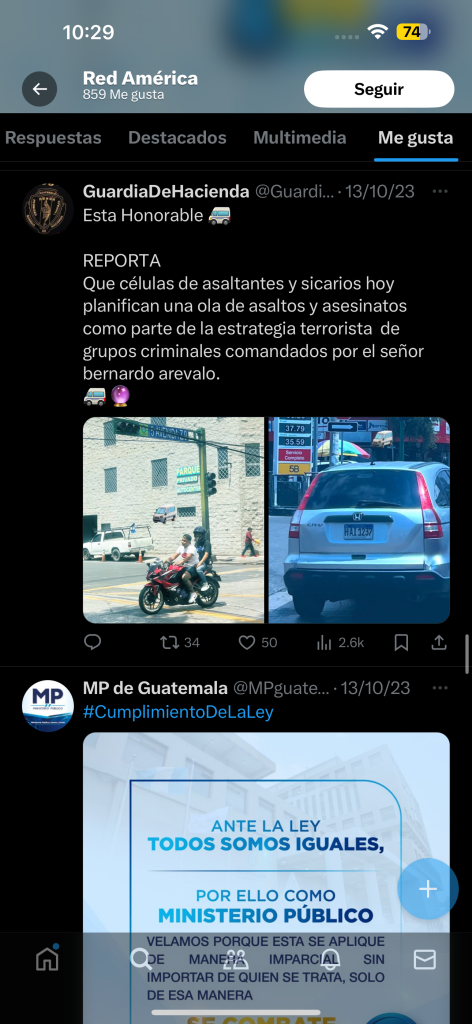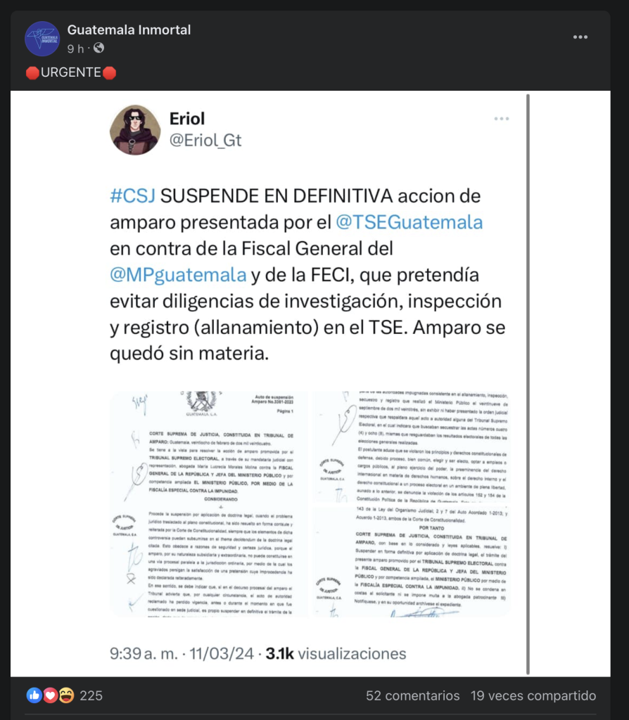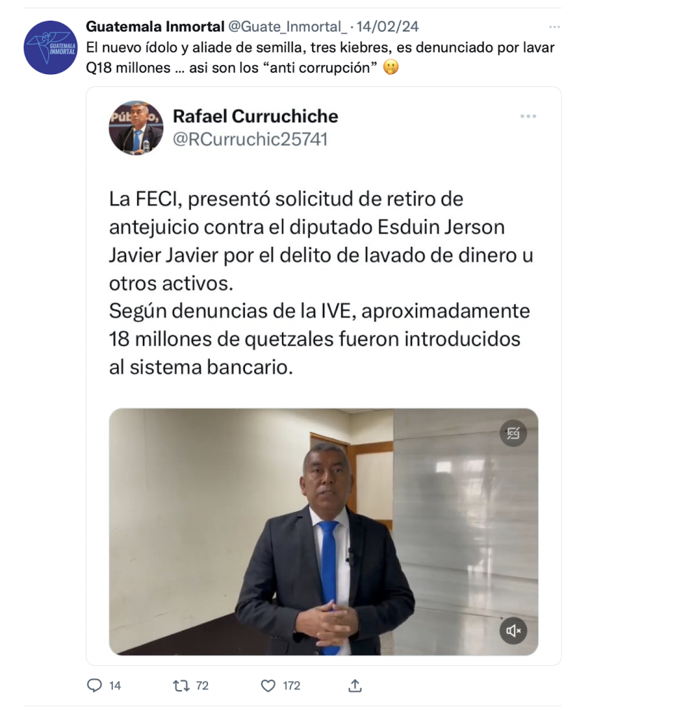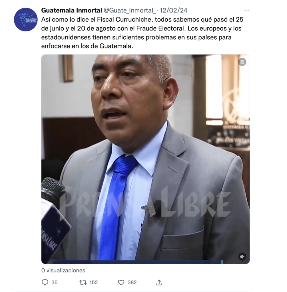 Esta cuenta anónima a la que hizo referencia la misión de observación se encarga de publicar con varios días de anticipación acciones de la Fiscalía Especial Contra la Impunidad (FECI) que está a cargo del fiscal Rafael Curruchiche.