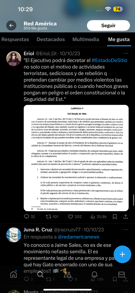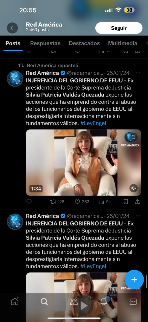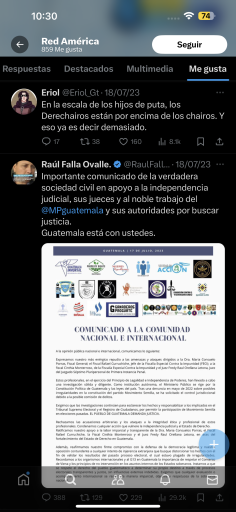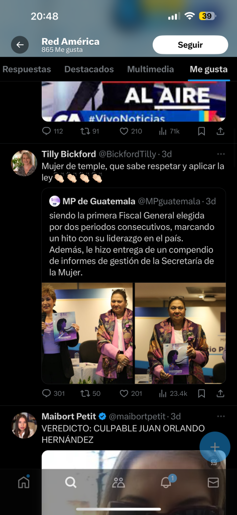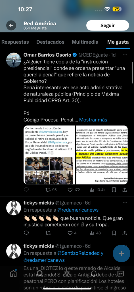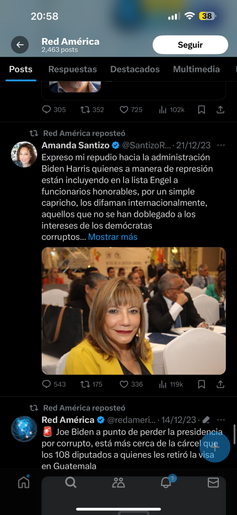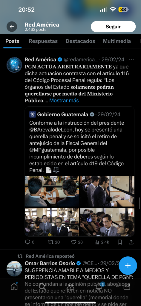 Red América comparte publicaciones de Omar Barrios Osorio, un abogado cercano a las magistrada de la Corte de Constitucionalidad Leyla Lemus, quien también su sancionado por el gobierno estadounidense y una de las personas más cercanos al expresidente Alejandro Giammattei y a su pareja Luis Miugel Martínez Morales.
