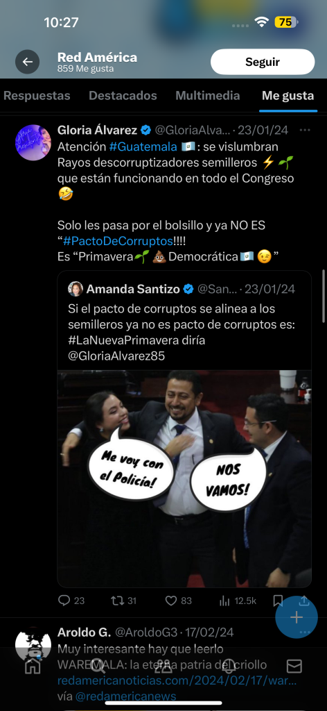 El contenido de la diputada de la bancada Valor, Sandra Jovel también es republicado al igual que el de Gloria Álvarez, una politóloga que en el presente es crítica del presidente Bernardo Arévalo y del partido Movimiento Semilla.