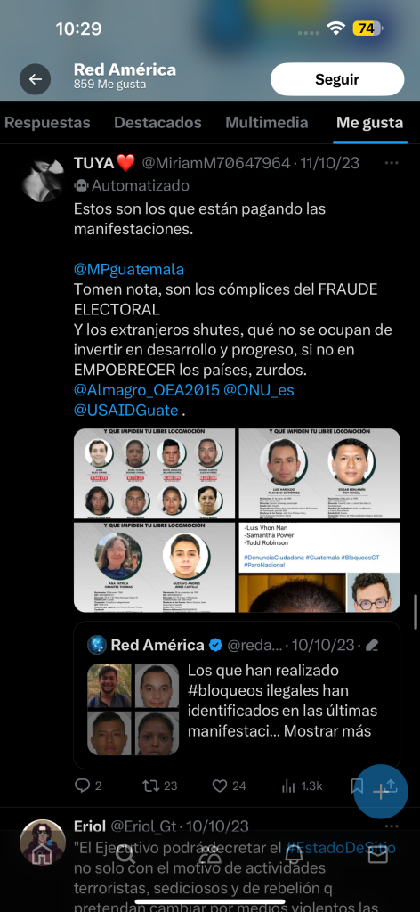 Por ejemplo, el pasado 10 de octubre Red América publicó en sus redes sociales un supuesto listado con la información privada de supuestos manifestantes que participaron en los bloqueos que exigieron la renuncia de la fiscal general, Consuelo Porras.
