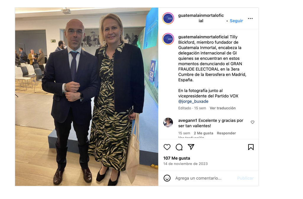 Por su parte, Tilly Bickford es fundadora de Guatemala Inmortal y los representa en eventos internacionales. En redes sociales de la organización está documentado los viajes que hacen Bickford en compañía de Giovanni Fratti.