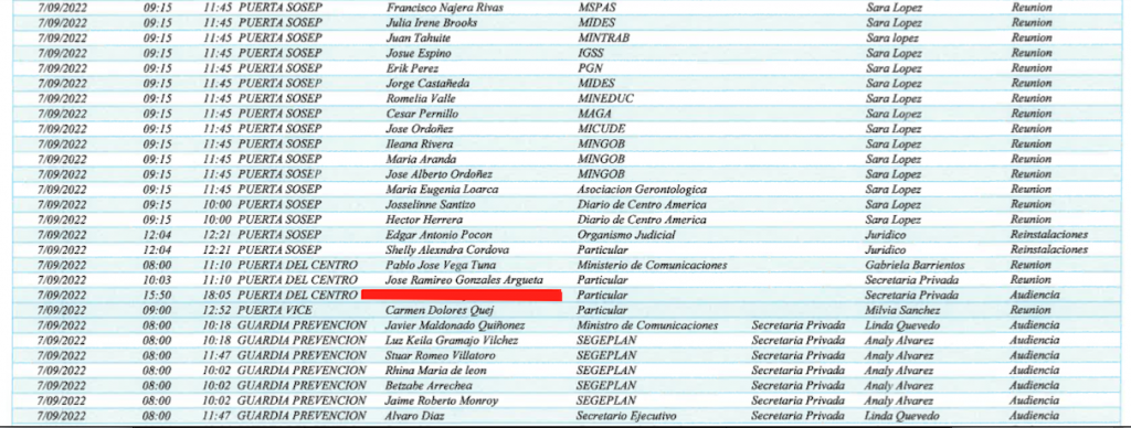 El 7 de septiembre Roberto llegó a Casa Presidencial para explicarle su situación y del video a Mynor Alfonso De la Rosa Palacios, entonces secretario privado de Alejandro Giammattei. Su visita quedó registrada en los archivos de la seguridad presidencial a los que Vox Populi tuvo acceso.