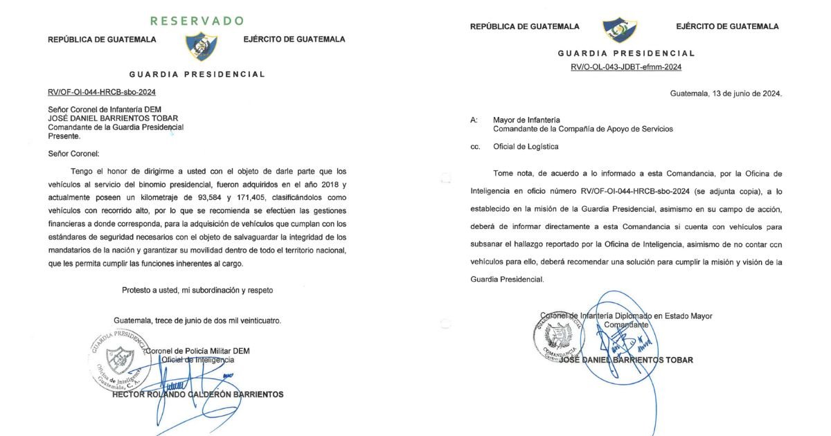 El Ministerio de la Defensa Nacional (Mindef) a través de la Guardia Presidencial (GP) compró dos camionetas Toyota Land Cruiser por Q1.8 millones (US$233 mil) y las blindaron por Q824 mil (US$107 mil). Estas son para el uso exclusivo del presidente Bernardo Arévalo y la vicepresidenta Karin Herrera.