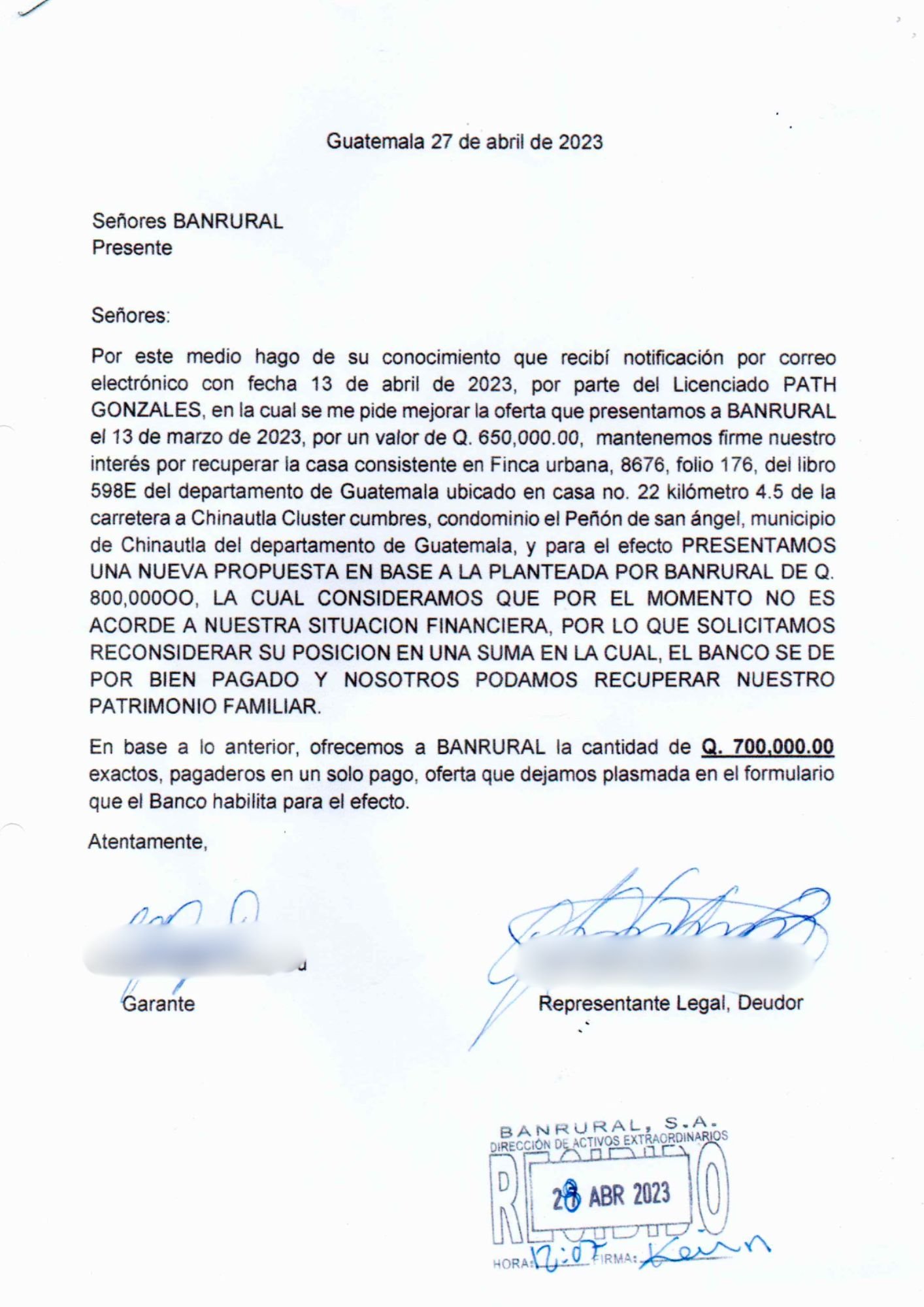 El 27 de abril enviaron otra carta en la que ofrecieron pagar Q700 mil al contado y Banrural les rechazó esa oferta porque pedían Q800 mil. Al final el banco decidió dejarlos sin la posibilidad de recuperar su casa.