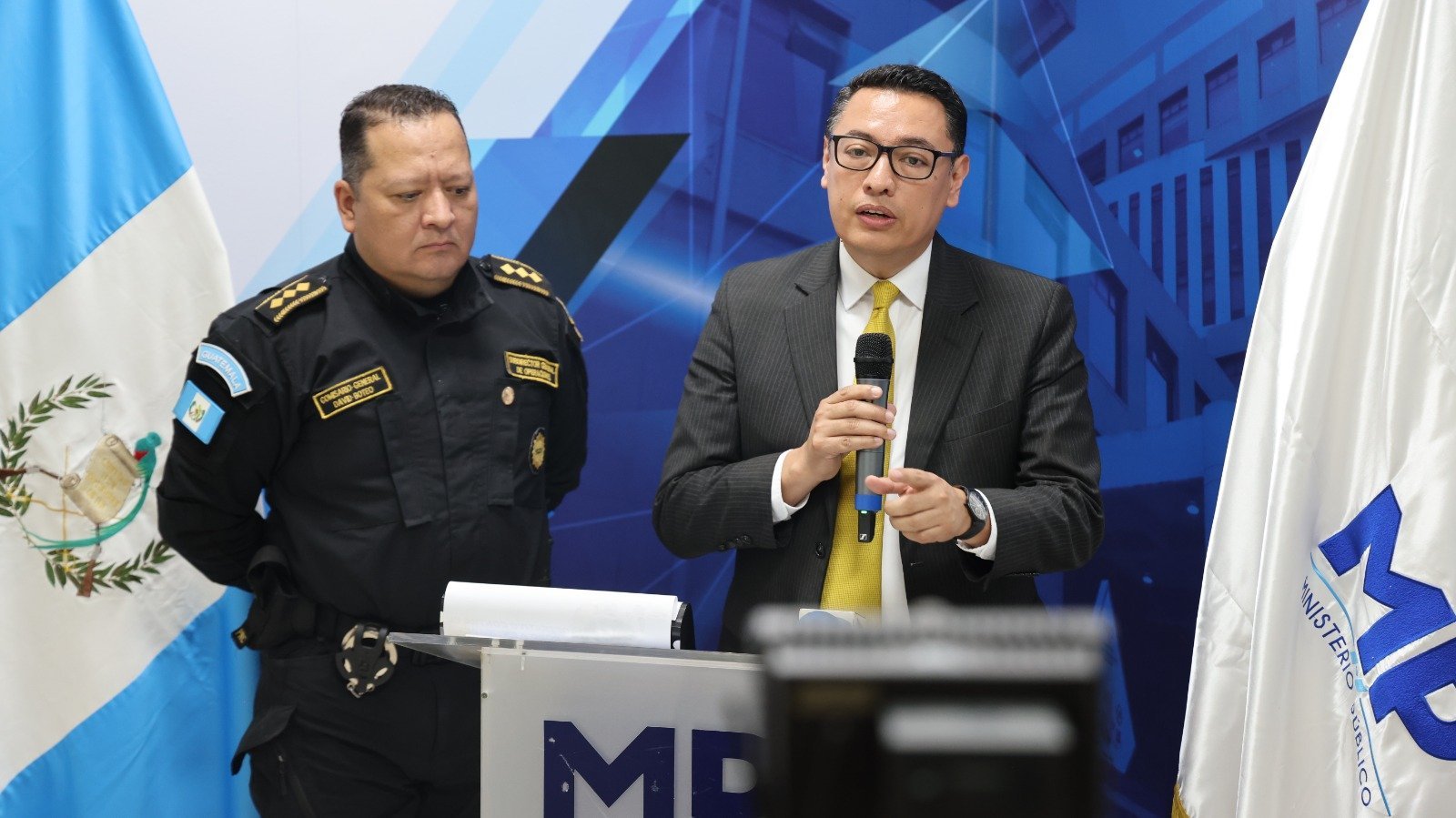 Klayber Bladimiro Sical Jiménez junto al director de la Policía Nacional Civil, David Custodio Boteo en conferencia de prensa. (Fotografía: Ministerio Público)