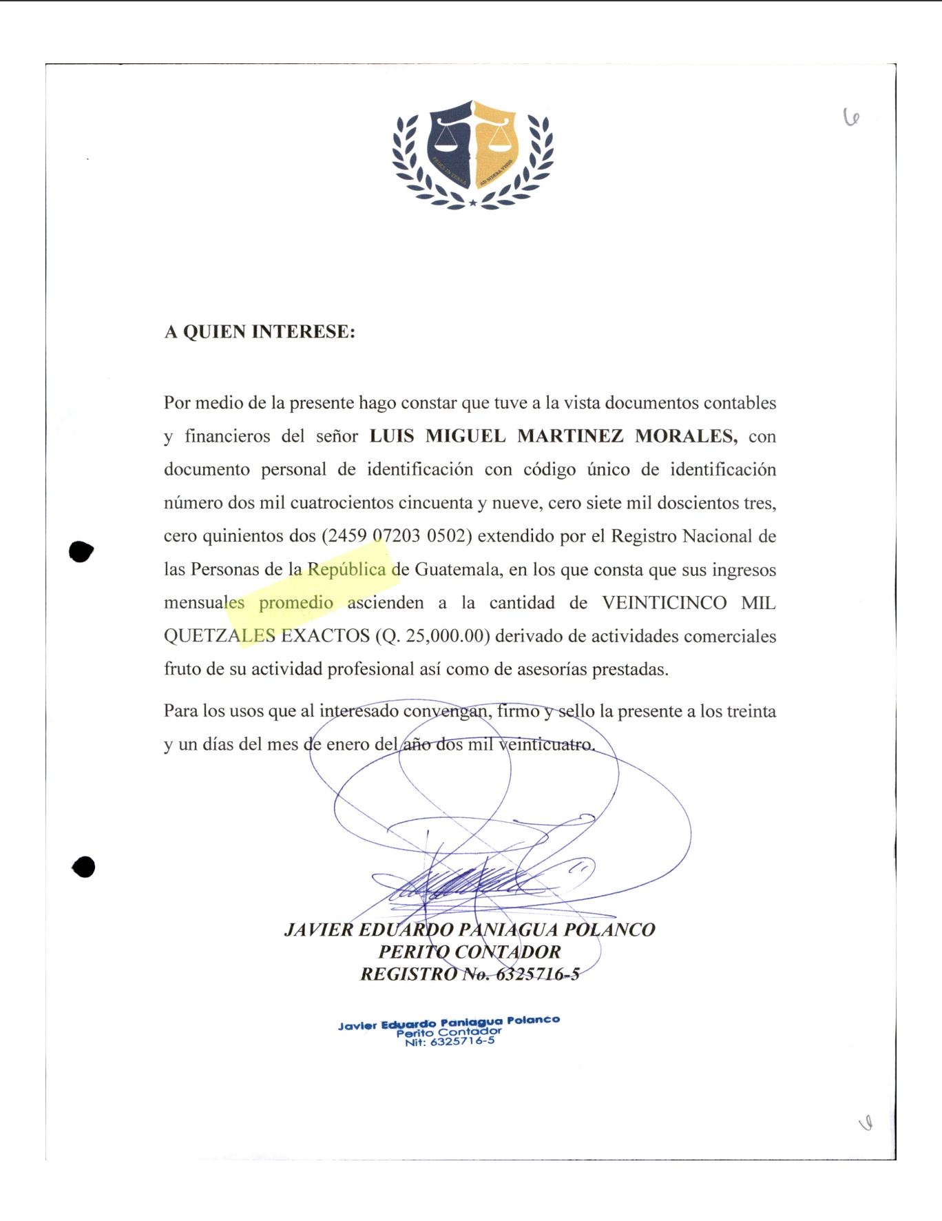 Esa investigación documentó que en el expediente CNA-AN-028-2024, Miguel Martínez presentó una carta firmada por el contador Javier Eduardo Paniagua Polanco (registro 63257165) en la que afirma tener ingresos mensuales por Q25 mil (unos US$3 mil) producto de “actividades comerciales fruto de su actividad profesional así como de asesorías”.