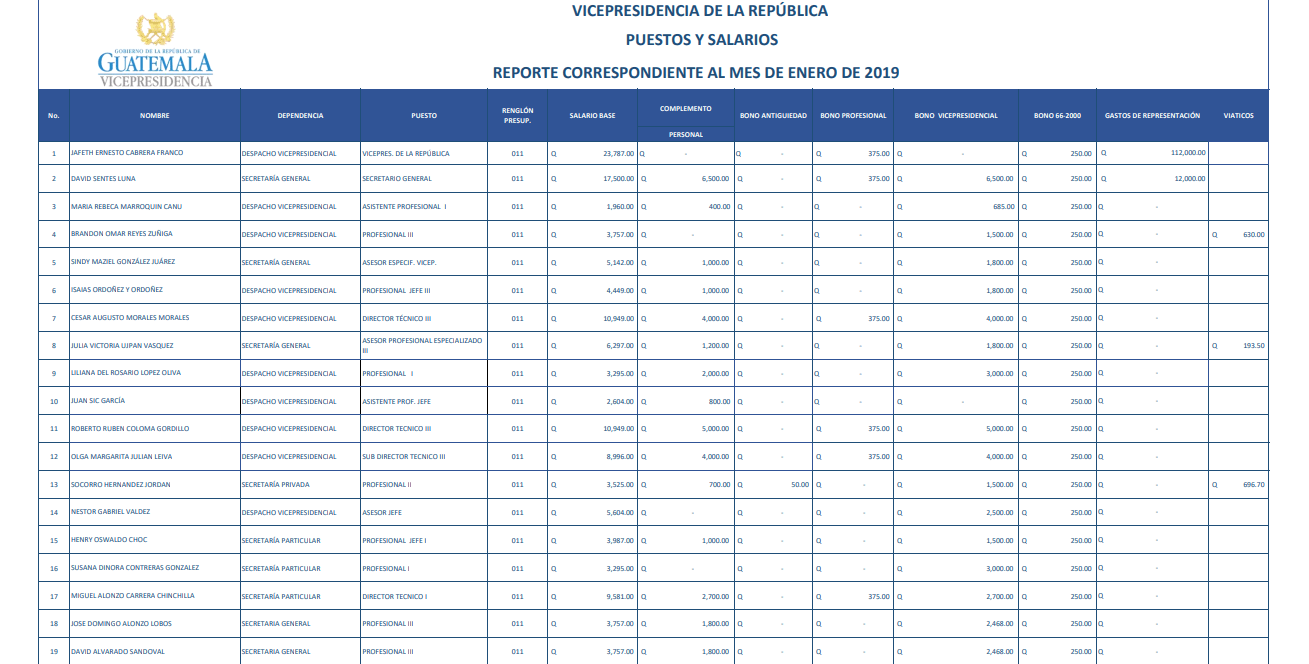 Según los registros de la Secretaría de Asuntos Administrativos y de Seguridad de la Presidencia (SAAS) el sueldo de Morales se distribuyó de la siguiente manera: Q115 mil de gastos de representación, Q33 mil 588 de sueldo base y Q250 de bonificación.