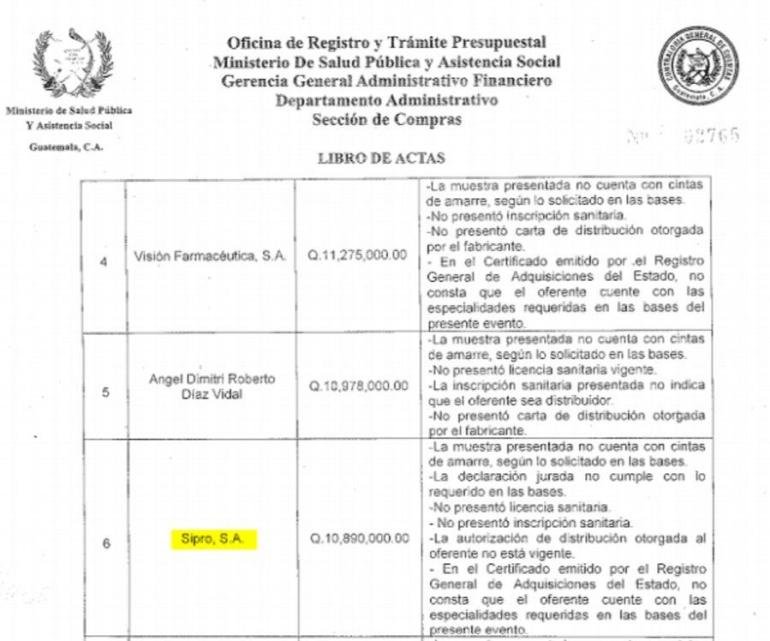 La encargada del Ministerio de supervisar la licitación fue Wendy Paola Zambrano Bonilla de Ramírez, quien señaló en el acta 67-2020, de fecha 19 de mayo, que la empresa Sipro, S.A. fue descartada porque no presentó licencia sanitaria, inscripción sanitaria y porque la autorización de distribución otorgada no está vigente.