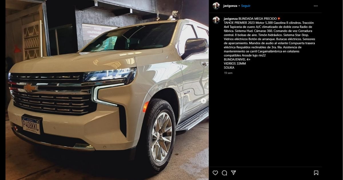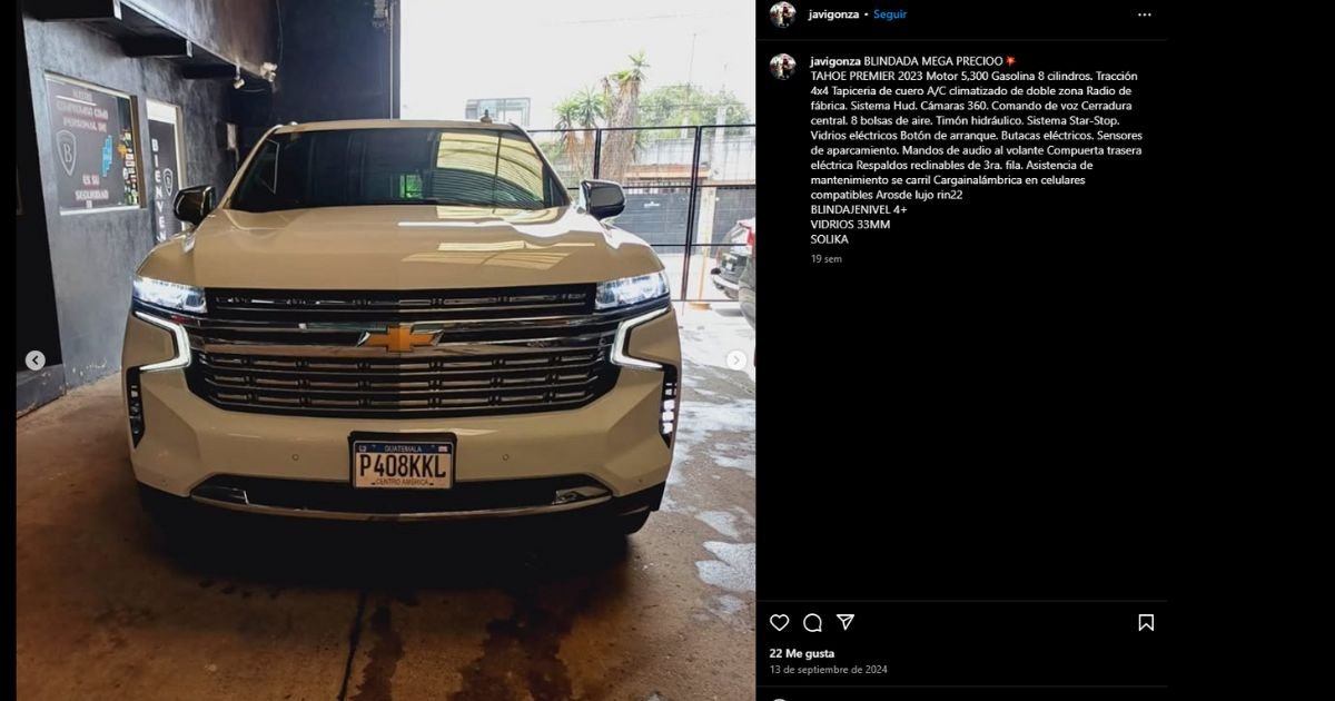 Javier publicó en sus redes el 13 de septiembre pasado que se vendía la camioneta Chevrolet Tahoe Premier modelo 2023. “Blindada a mega precio”, decía el posteo en el que compartió nueve fotografías del vehículo que estaba en las instalaciones de Blindegua, S.A.