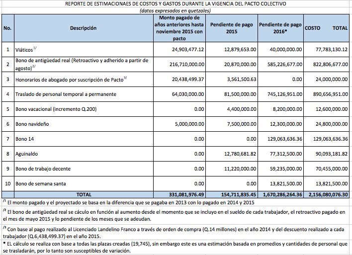 Durante el proceso de nulidad del pacto colectivo, que aun continua, la PGN expuso que dicho documento se avaló sin tener los dictámenes financieros del ministerio de Finanzas Públicas. En ese entonces, se expuso que el pacto colectivo de salud representaba un costo anual de Q2 mil 156 millones.
