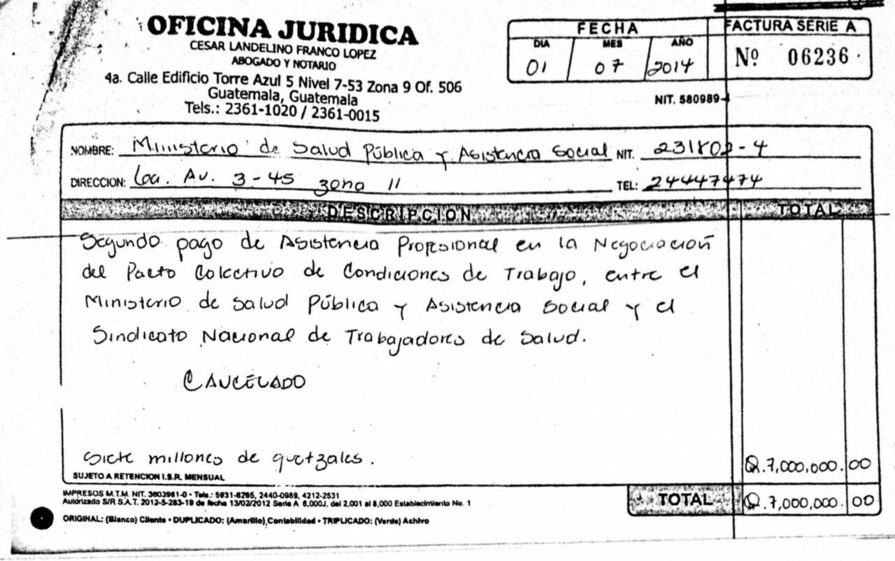 Landelino Franco no recibió los Q14 millones exactos, tuvo que pagar impuestos y en su cuenta bancaria ingresaron Q12.7 millones, que fueron cancelados en dos pagos, tras entregar dos facturas al ministerio por Q7 millones cada una.