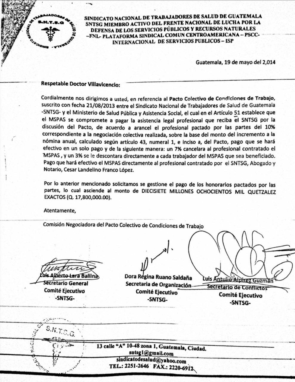 Luis Enrique Monterroso De León, exministro de Salud después de la destitución de Villavicencio, explicó a Vox Populi que cuando asumió el cargo, Franco López acompañado de Luis Lara y Regina Ruano exigieron el desembolso de cerca de un poco más de Q6.4 millones, que era la parte que les correspondía a los sindicalistas pagarle al abogado Cesar Landelino. Ese porcentaje se encuentra establecido en el artículo 51.