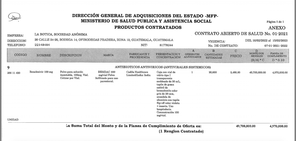 El 7 de febrero de 2022 el Ministerio de Finanzas y el Ministerio de Salud firmaron un contrato abierto con La Botica, S.A. para que durante un año sea el proveedor del fármaco Remdesivir. Se estableció que el precio de venta de cada dosis será de Q2 mil 485 (unos US$330), es decir, cada dosis del Remdesivir genérico (bajo costo) tendrá un precio similar al original.