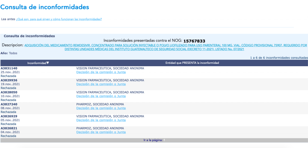 Inconformidades presentadas en la licitación de Q39 millones otorgada a La Botica, Sociedad Anónima. (Imagen: Guatecompras)