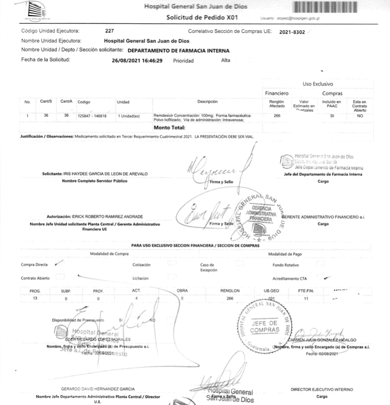 Los requerimientos del Remdesivir en el Hospital General San Juan De Dios fueron firmados por cinco encargados entre ellos el entonces director, Gerardo David Hernández García. (Imagen: Guatecompras)