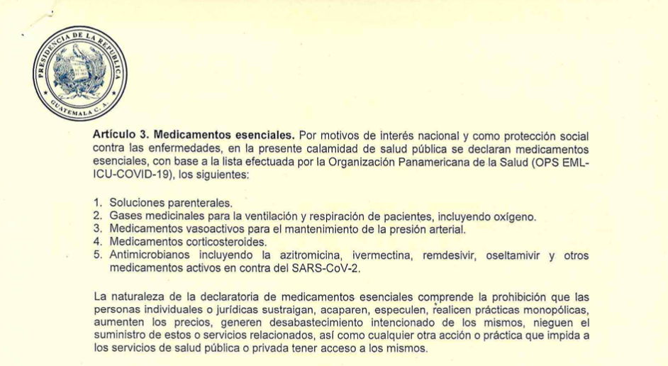 Al consultar a Evelin García, jefa del Departamento de Abastecimiento del IGSS sobre la decisión de usar el Remdesivir en sus afiliados dijo que las compras se hicieron por los decretos emitidos por el gobierno (aprobados por el presidente Alejandro Giammattei y sus ministros) en el que se aprueba el uso de ese fármaco.