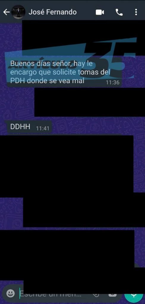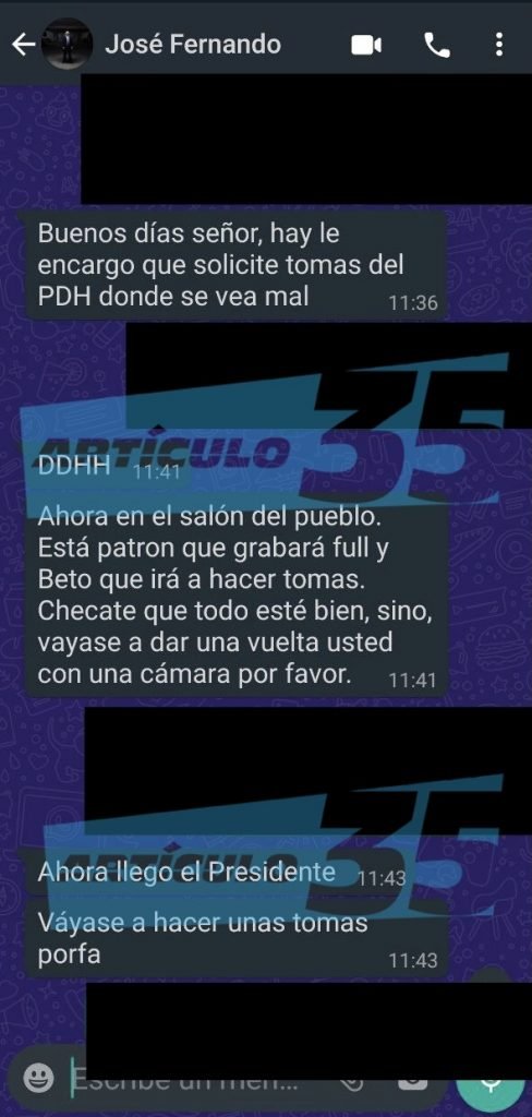 «Con lo del video del PDH necesito que lleve imagen y texto, los textos que te envié, que se vea en donde está en la  tarima hablando (…) el video tiene el objetivo de hacerlo ver político, entonces eso es lo que hay que demostrar, que él ha estado haciendo un trabajo político desde la Procuraduría de Derechos Humanos, incluí, incluso la foto que él tiene en su perfil de Twitter»