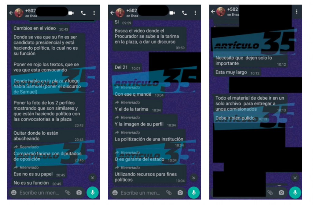 En el mismo chat, Joselyn Mérida giró instrucciones para que se señalara que el Procurador de los Derechos Humanos “compartía tarima con diputados de oposición” y que “todo el material debe ir en un solo archivo para entregar a unos comisionados. Debe ir bien pulido”.