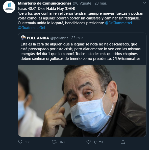 Poll Anria y Kif Nava no tienen bajo perfil. Sin embargo, uno es más activo que el otro en cuanto a su función el Gobierno de Guatemala. Anria ha posteado en redes sociales las acciones de Giammattei en relación con el Coronavirus e incluso en Twitter ha bloqueado a quienes lo cuestionan, mientras que Nava no dice nada sobre esos temas.